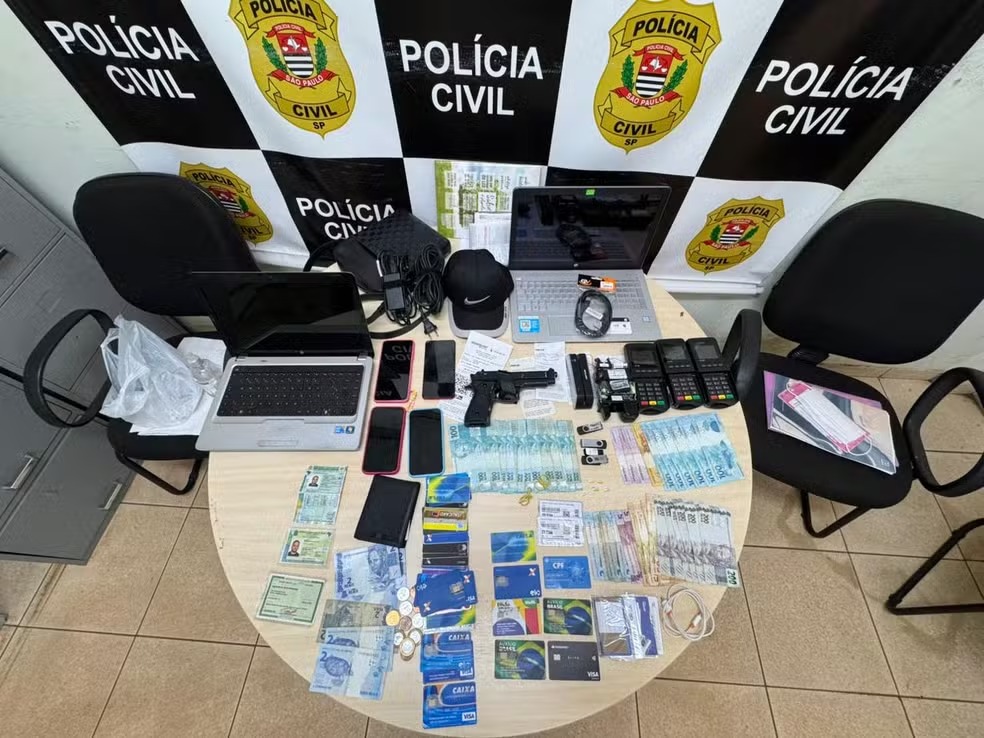 Na ação, a polícia apreendeu 33 cartões, chips de celular em nomes de terceiros, computadores, celulares, máquinas de cartão, pen drives, um equipamento usado para clonar dados, uma pistola de airsoft e mais de R$ 3 mil em dinheiro. O caso está sendo investigado como estelionato e crime de acesso ilegal a dados pessoais.