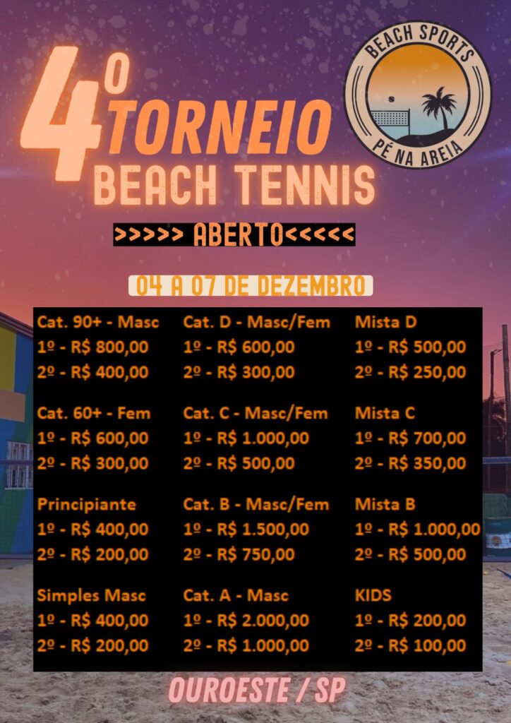 A quarta edição do Torneio de Beach Tennis de Ouroeste começa hoje e segue até domingo (7), consolidando-se como um dos maiores eventos esportivos da região. Organizado pelo Beach Sports Pé na Areia, o torneio reúne atletas de 20 cidades e oferece premiação superior a R$ 20 mil, além de troféus para os vencedores.