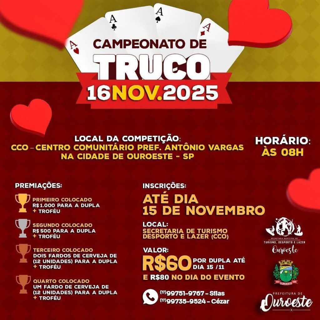 O Campeonato de Truco de Ouroeste acontece no dia 16 de novembro de 2025, a partir das 8h, no CCO – Centro Comunitário Prefeito Antônio Vargas. O evento é aberto a duplas que queiram participar da competição e concorrer às premiações.