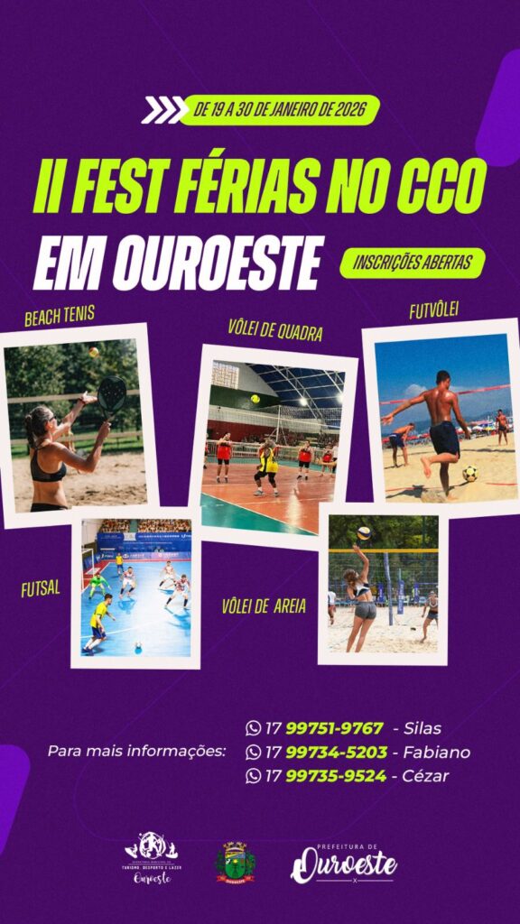 O esporte promete ser o grande destaque das férias em Ouroeste com a realização do II Fest Férias no CCO, que acontece entre os dias 19 e 30 de janeiro. O evento reúne diversas modalidades esportivas e é voltado para participantes de todas as idades, promovendo integração, saúde e diversão.