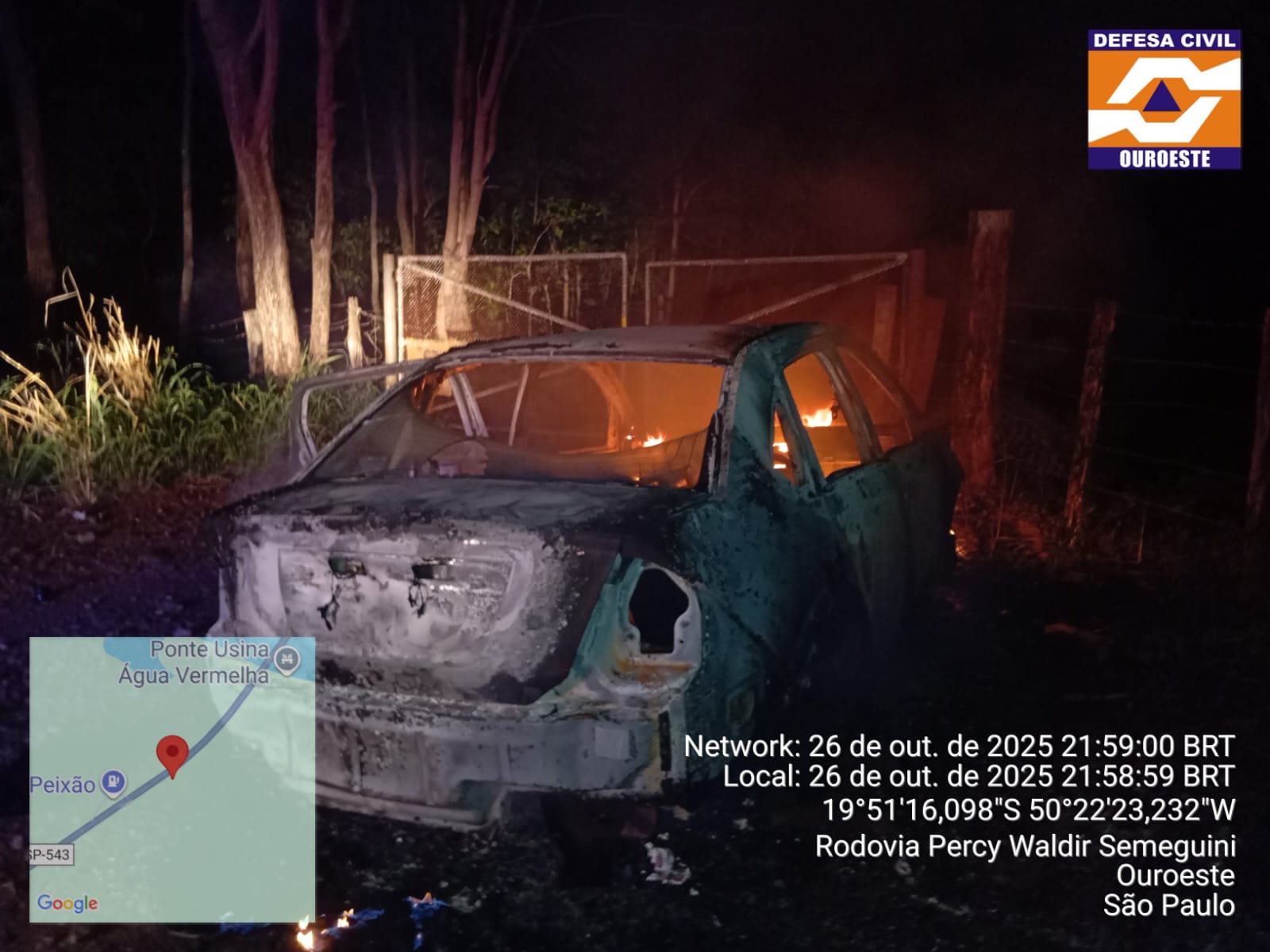 Um Ford Fiesta Sedan, com placa de Votuporanga, foi encontrado em chamas na noite deste domingo (26), às margens da Rodovia Percy Waldir Semeghini, em frente ao restaurante Peixão, em Ouroeste. De acordo com a Polícia Militar, o veículo havia sido furtado em Fernandópolis por volta das 21h.
